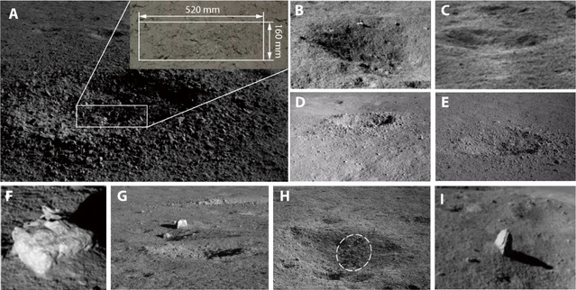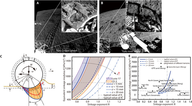 团队成员根据月球车车轮与月面作用的信息和地面力学模型估计了月壤的力学特性,结果表明,月壤风化层的承压特性与地球上的干沙和沙壤土类似,与美国阿波罗计划中的典型月壤相比具有更强的承压特性。在多个不同地点的图像中,观察到“玉兔二号”车轮粘附有大块团状土壤,而“玉兔号”车轮基本不存在粘土现象,这表明,嫦娥四号着陆区附近月壤内聚力较大,其原因可能是包含较高比例的凝集物,使土壤颗粒经车轮碾压更易团聚。