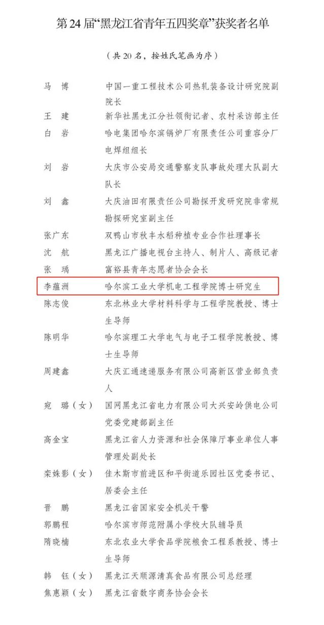 日前,黑龙江省青年五四奖章表彰名单公布,我实验室博士生李蕴洲荣获第24届“黑龙江省青年五四奖章”。