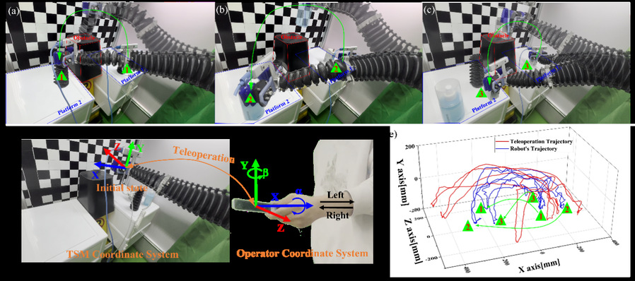 针对上述问题,团队成功研制出一种由复合肌腱和气动肌肉混合驱动的锥形软机械手设计及精密运动控制器。机器人的驱动结构由首次提出的鲍登管和电缆肌腱组成的复合肌腱和气驱锥形波纹管紧凑集成设计,实现了优异的可变刚度范围。团队提出的基于深度学习方法与闭环迭代反馈控制器结合的控制策略,实现了软机械手的精密运动控制。实验结果显示出毫米级控制精度和对外部扰动的自适应性,新型TSM软机械手在遥操作控制下成功进行了越障抓取操作,并验证了其在人手干扰下沿平面跟踪轨迹的任务能力,为软机械手设计与控制提供了新的解决途径。